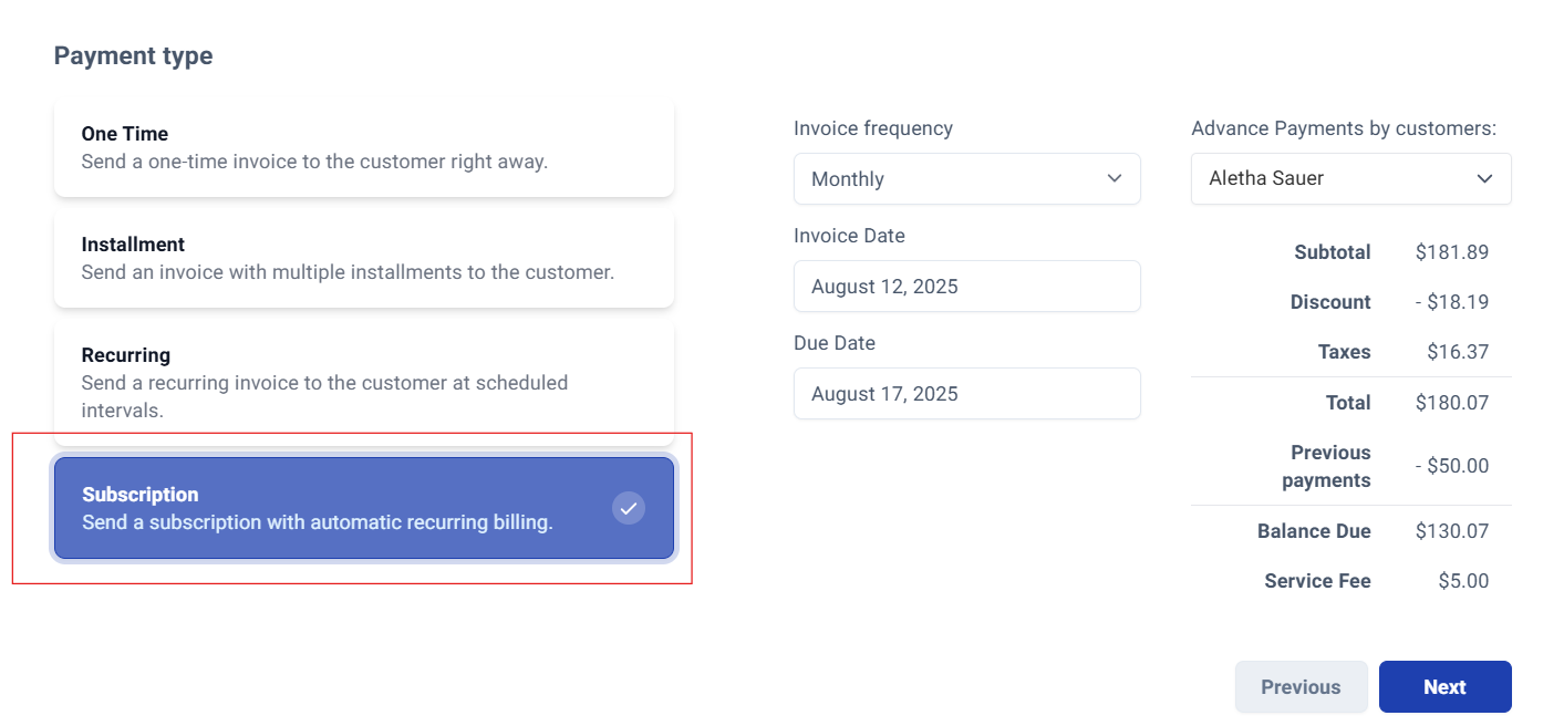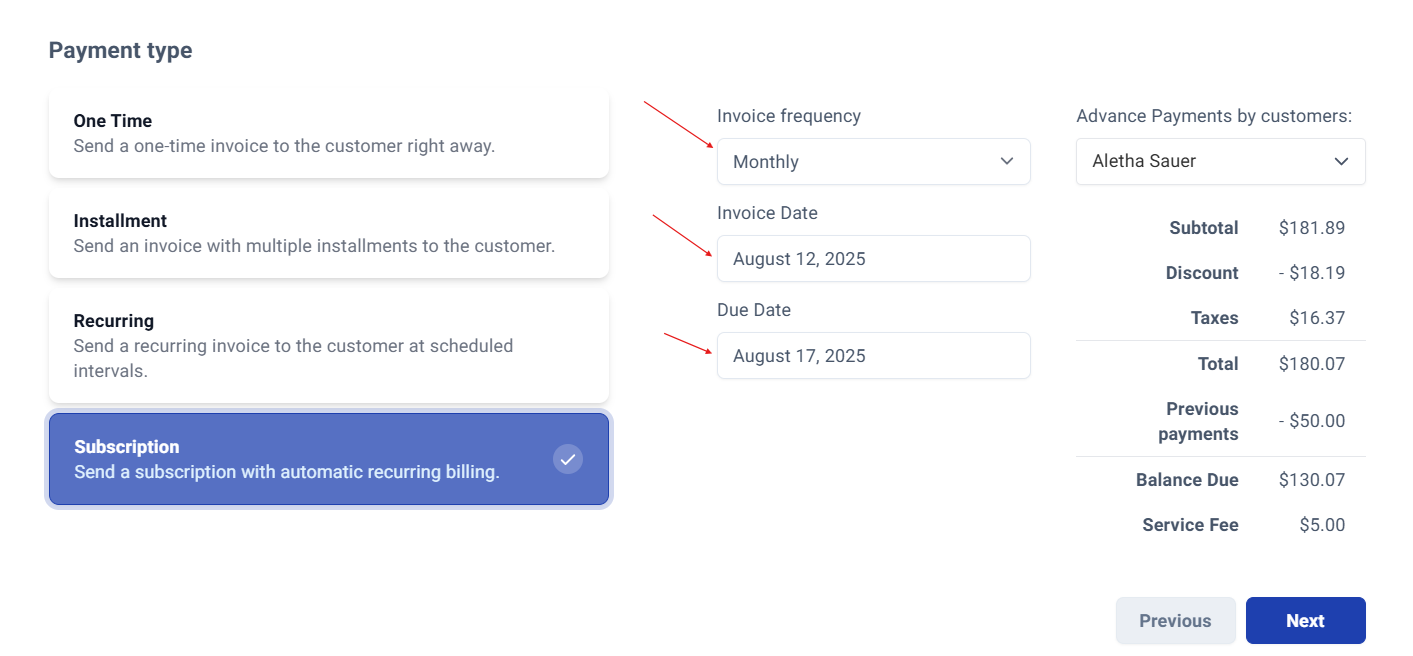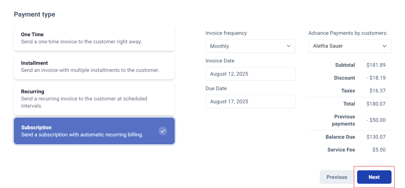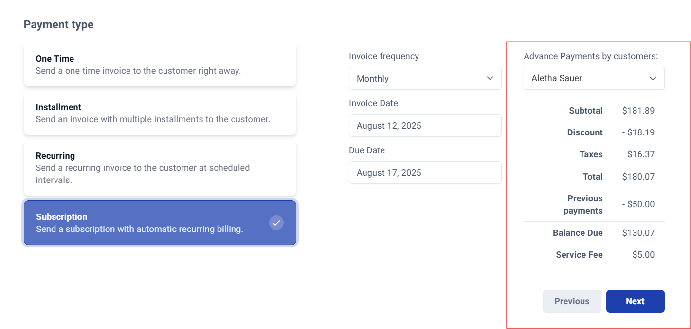 - Invoice frequency: Frequency in which the invoice will be sent.