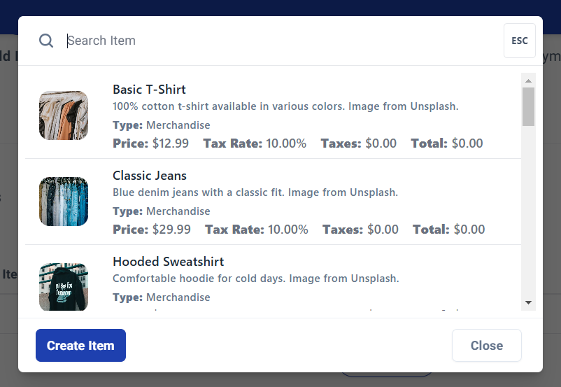 Select multiple items as needed, they'll be added automatically. When finished, click "Close" to return to the main invoice screen.