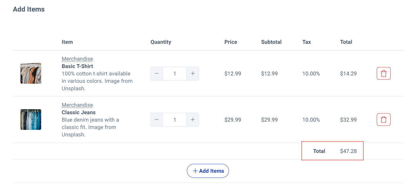 Browse the catalog and click on items to add them to your invoice. Use the search function at the top of the catalog to quickly locate specific items by keyword.