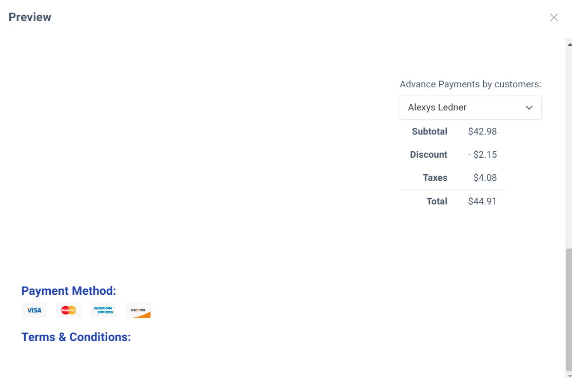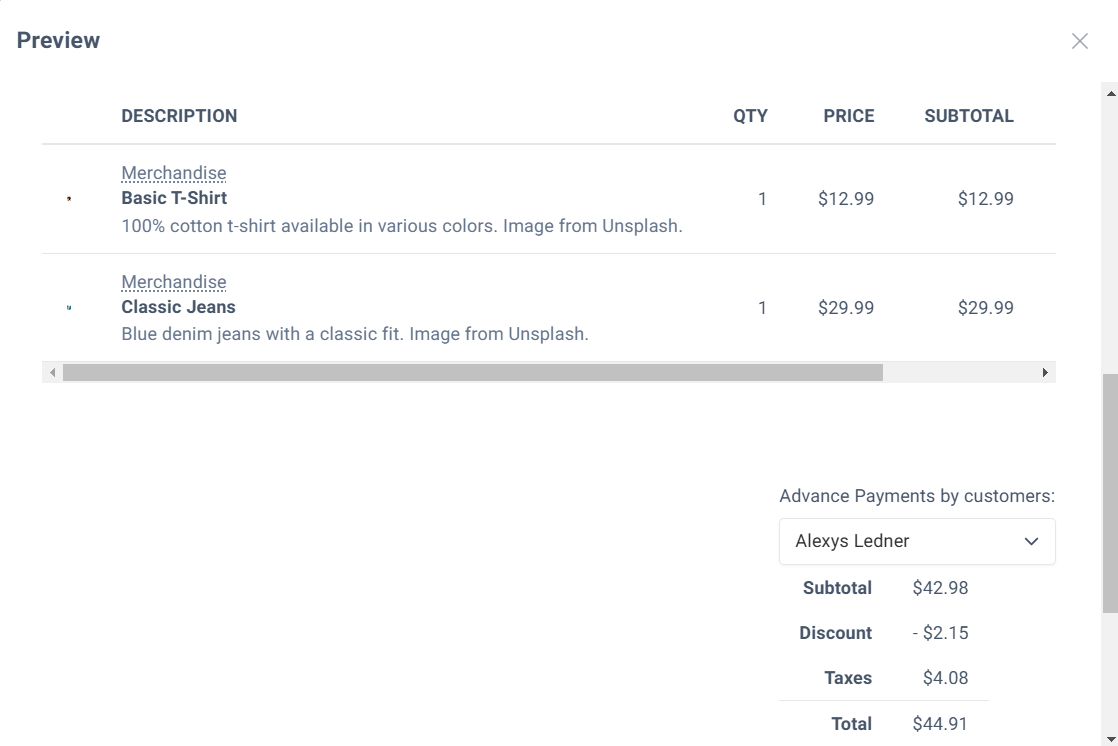 Click "Preview" in the bottom-left corner to view exactly how your invoice will appear to customers. This opens a new window displaying the formatted invoice.