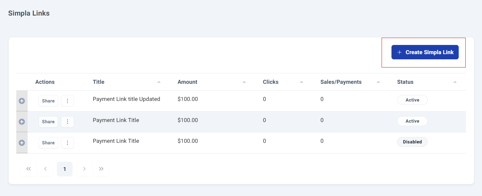 Navigate to your simpla links management section and click the "+Create Simpla Link" button located in the upper-right corner of the existing simpla link list.