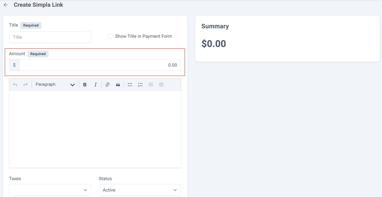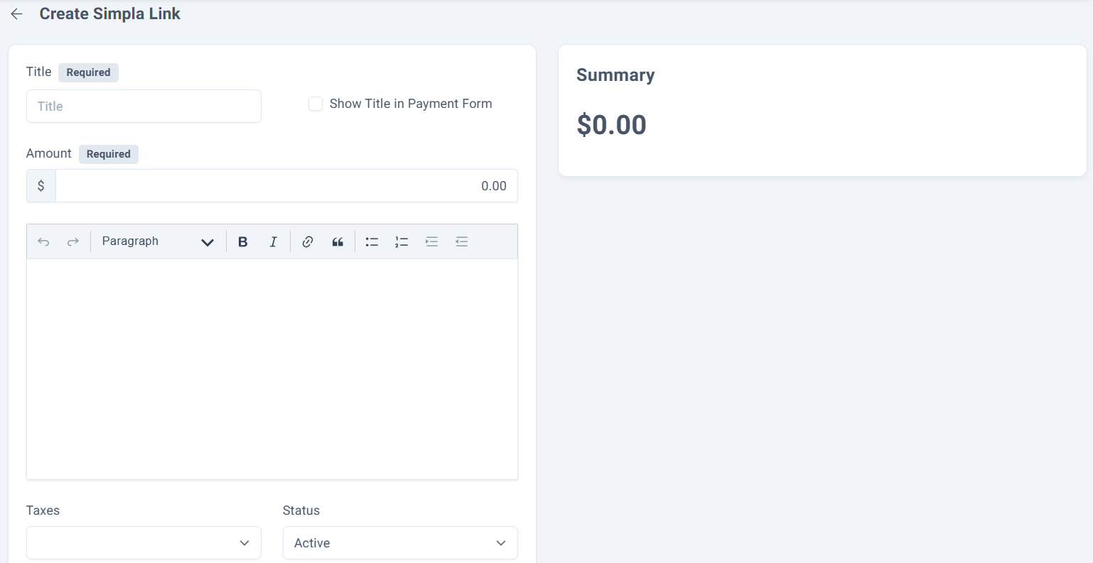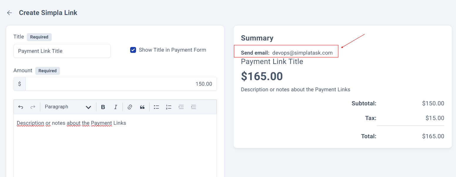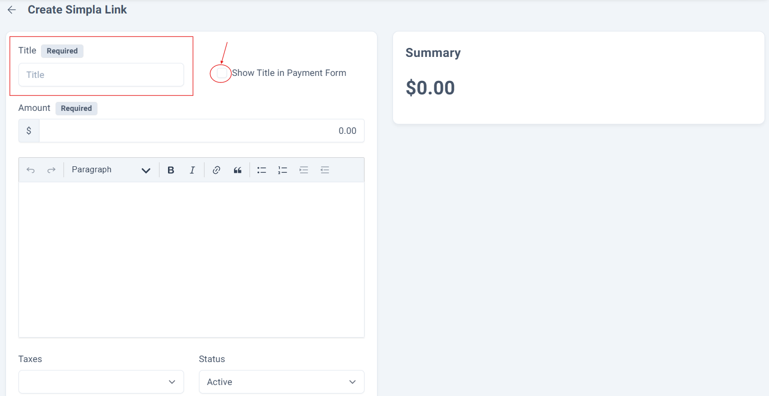 Enter a title for your Simpla Link, it is a required field. You can enable the option to display this title in the payment format.