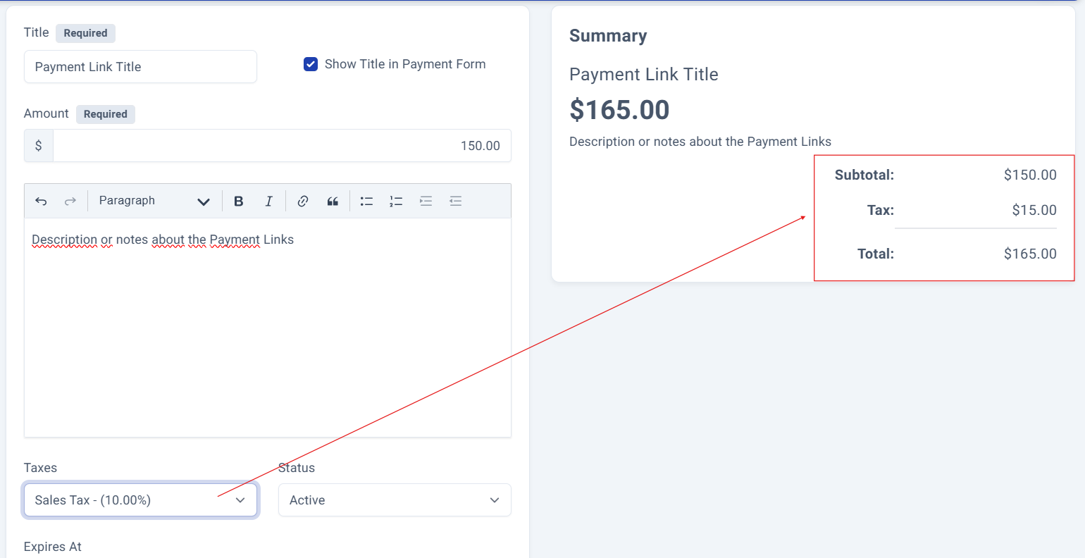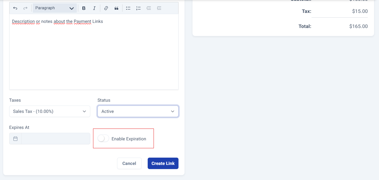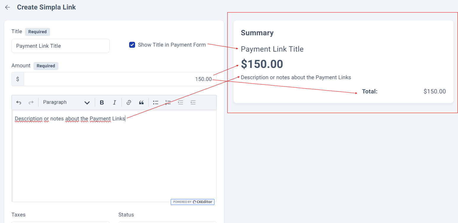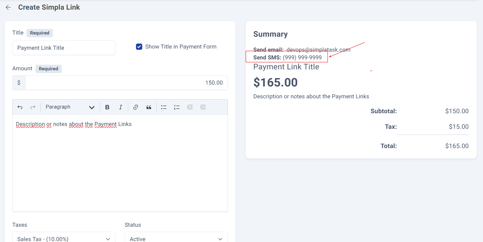 Enter a title for your Simpla Link, it is a required field. You can enable the option to display this title in the payment format.
