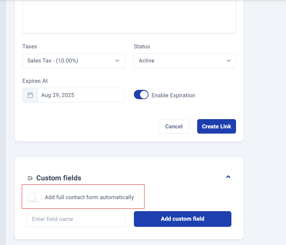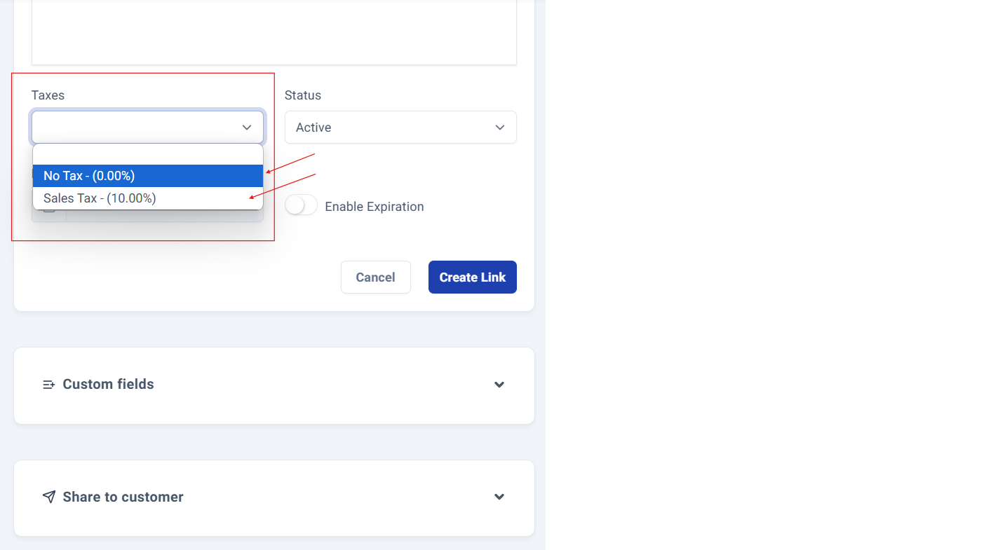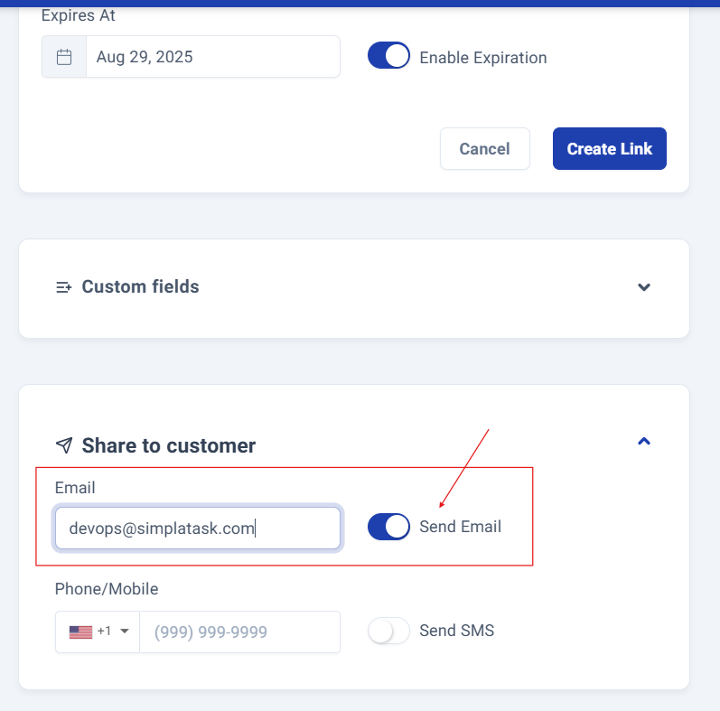 Simpla Link Customization Options: Custom fields and Share to Customer.