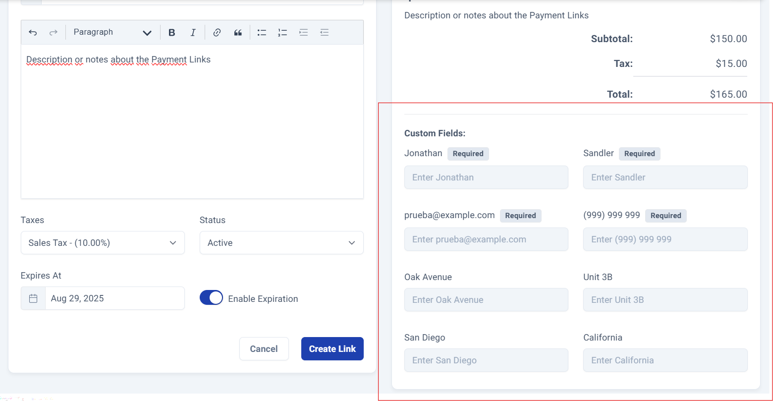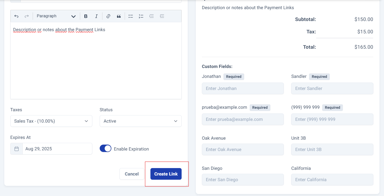 If you want to send the payment link to an email, enter the email address in the corresponding field and activate the option. This information will automatically appear in the summary.