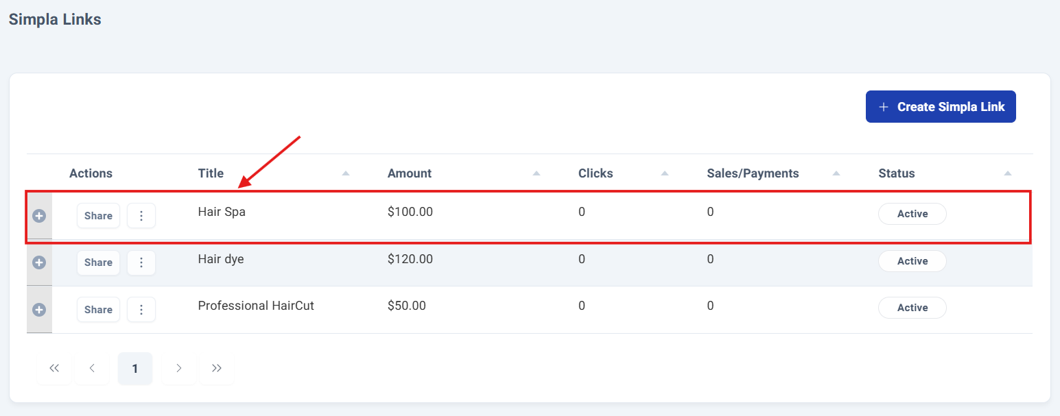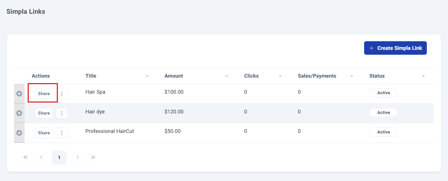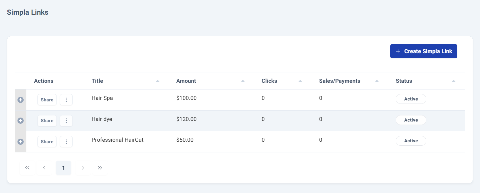 The first three columns provide quick-access options to perform various actions on your payment links.