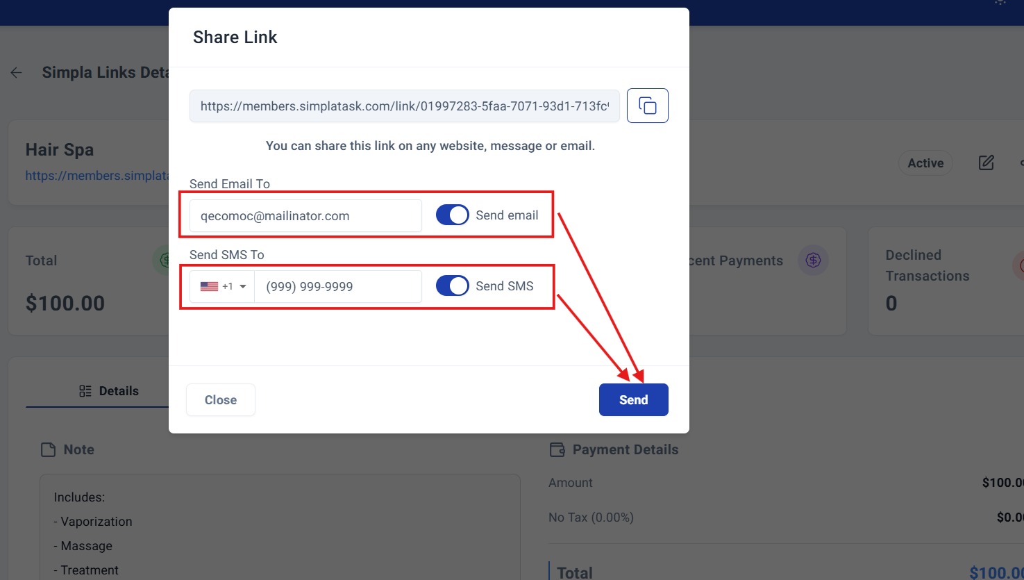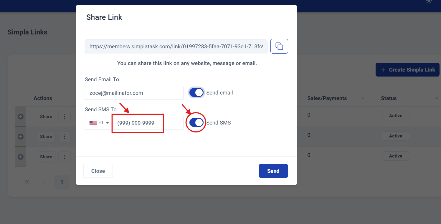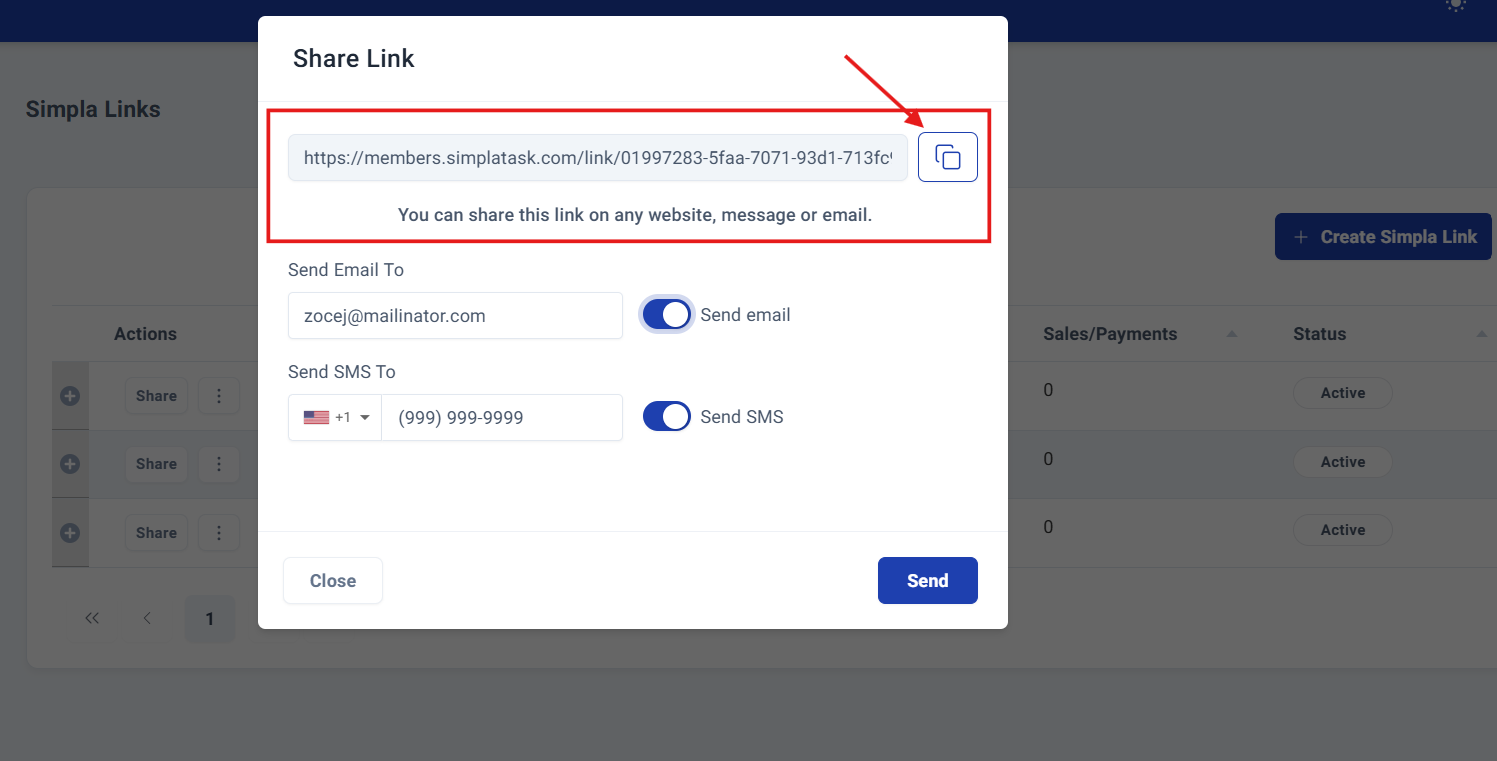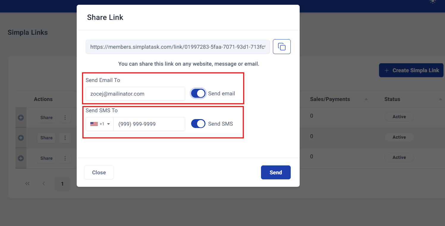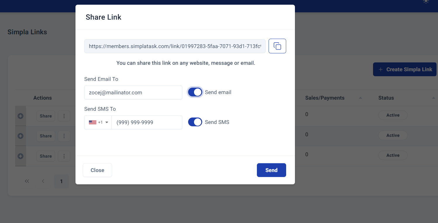 You have successfully sharing your Simpla Link. The payment link will be sent to the options you have selected and will be tracked in your SimplaTask dashboard.