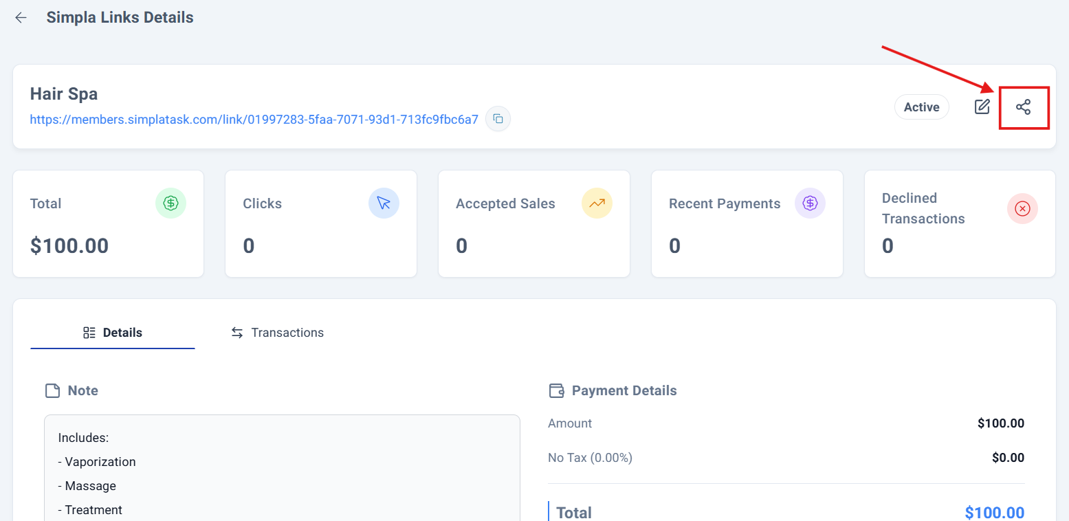 Another way to share is in the upper right corner of the payment link details, you'll find the Share Icon.