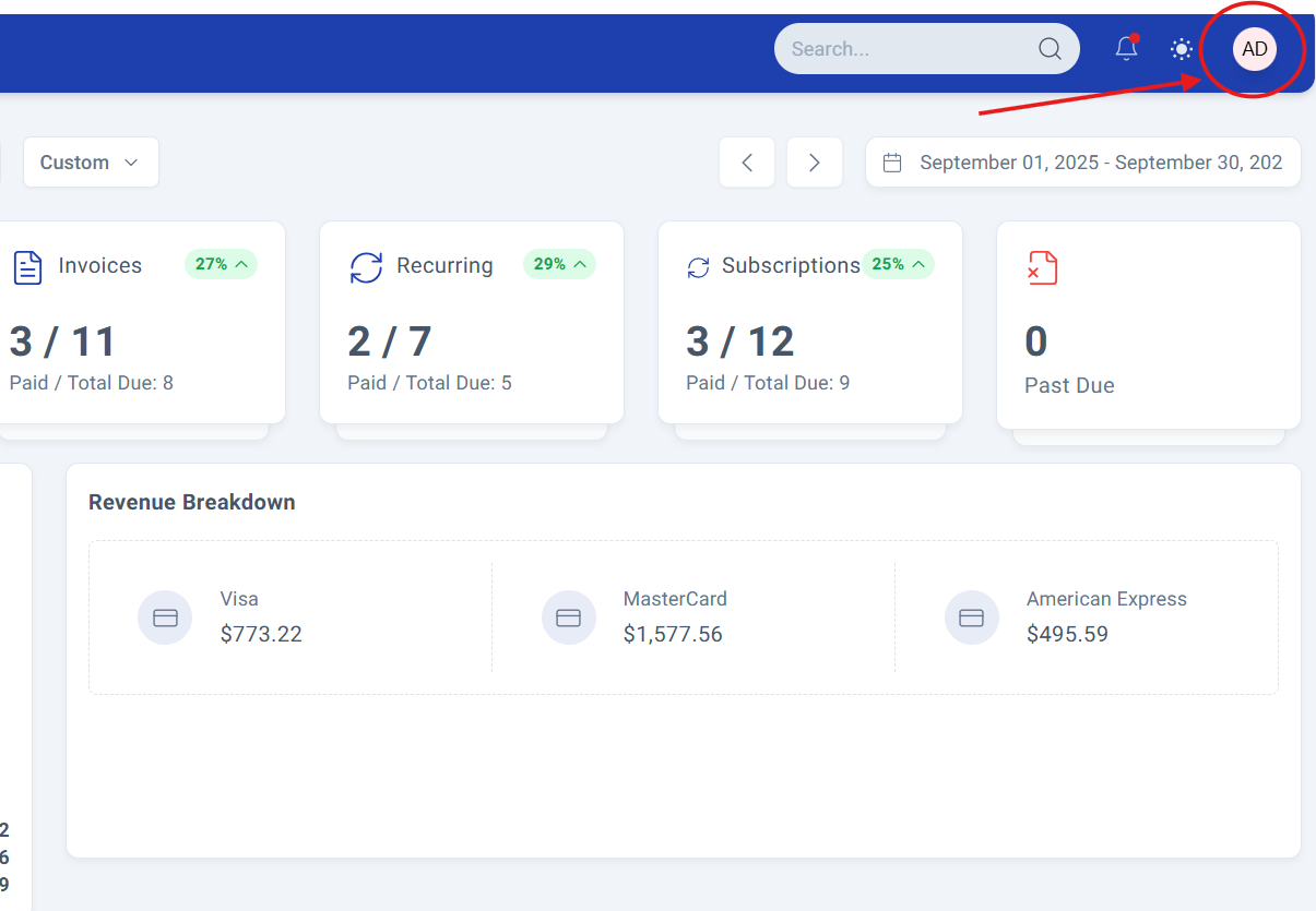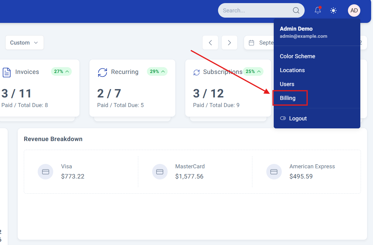 From your main dashboard, click your profile dropdown in the upper right corner and select "Billing" from the menu options.