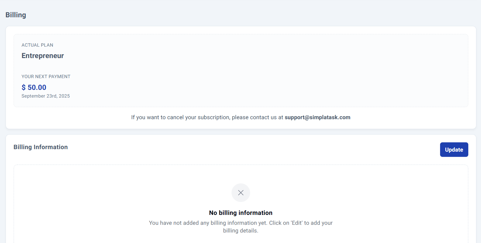SimplaTask streamlines your billing management with an intuitive interface that makes updating your information quick and effortless. This guide provides everything you need to manage your billing details from initial setup to ongoing updates.