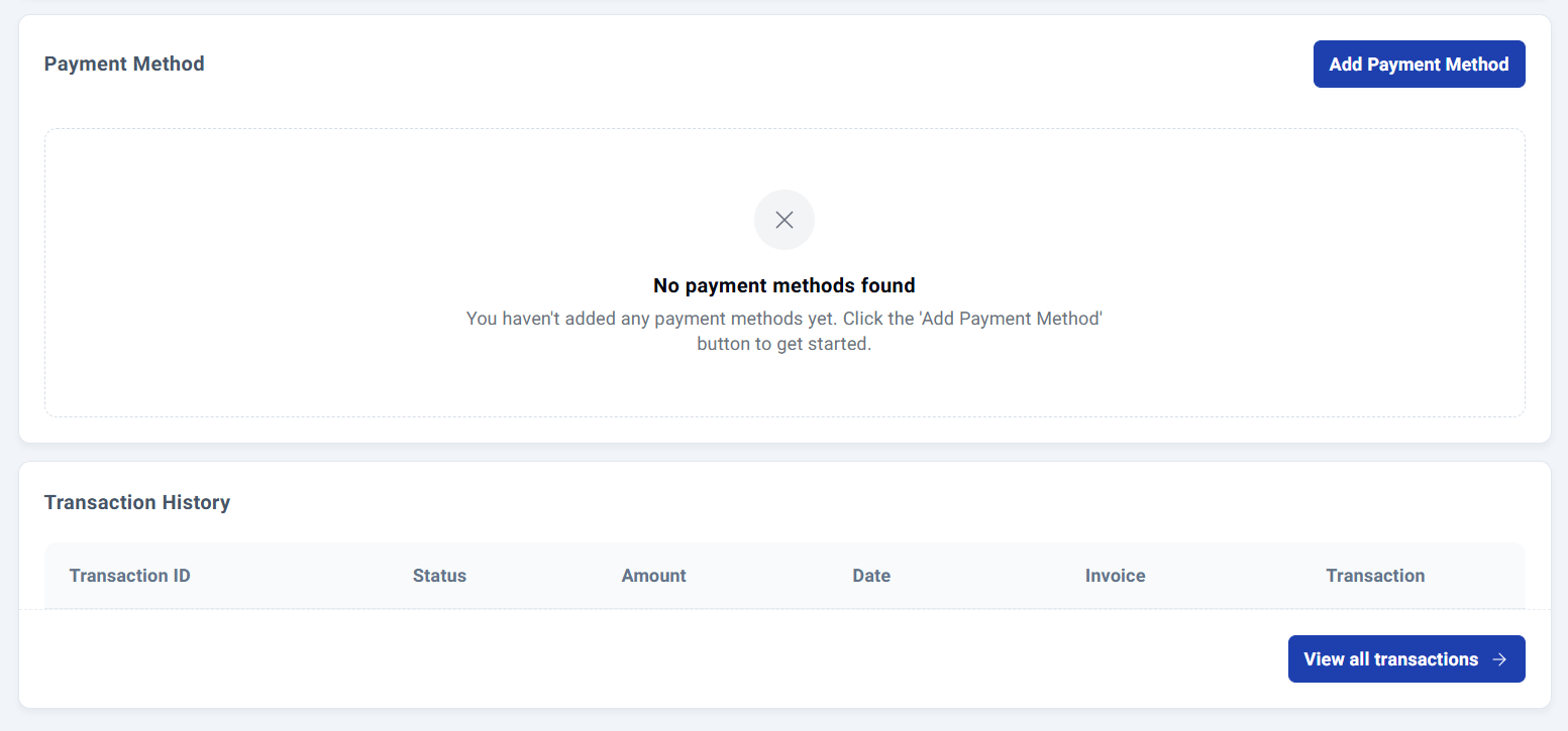 Your billing dashboard provides a comprehensive overview of your current plan, billing information, payment methods and recent transaction history. For new accounts, you'll see empty sections ready for your information.