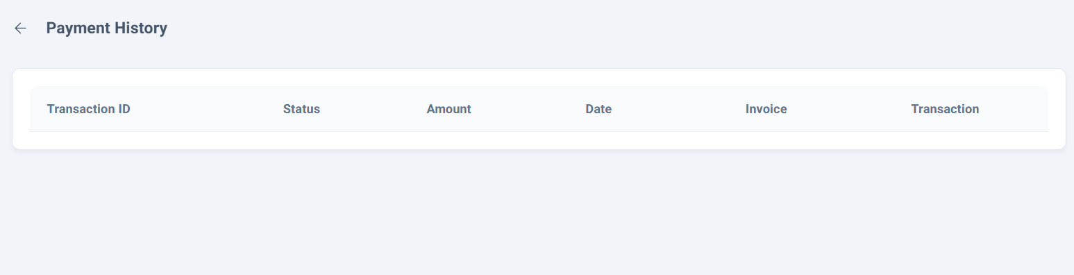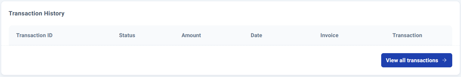 Your billing dashboard includes a comprehensive transaction history section at the bottom, providing instant access to payment status, amounts, dates, invoices, and transaction descriptions.