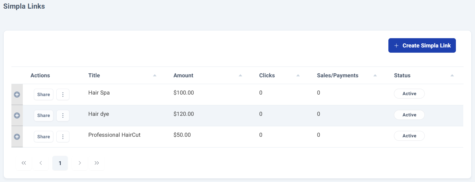 The dashboard displays all your created payment links along with essential information for each one.