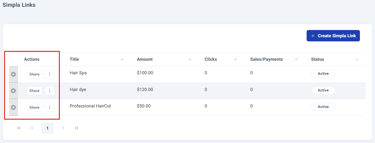 The first three columns provide quick-access options to perform various actions on your payment links.