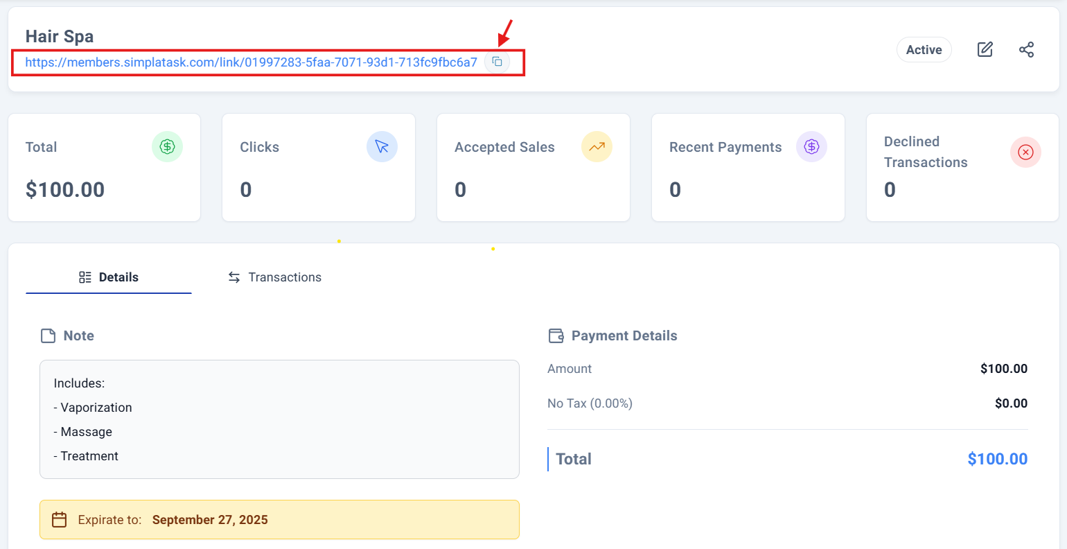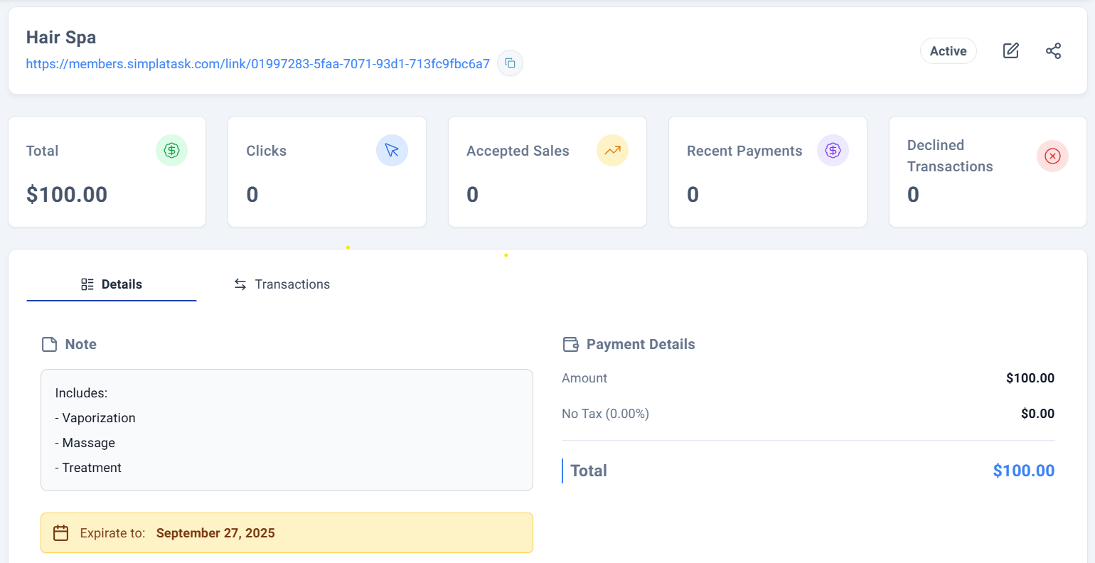 You have successfully accesing your Simpla Link details. The payment link will be tracked in your SimplaTask dashboard.