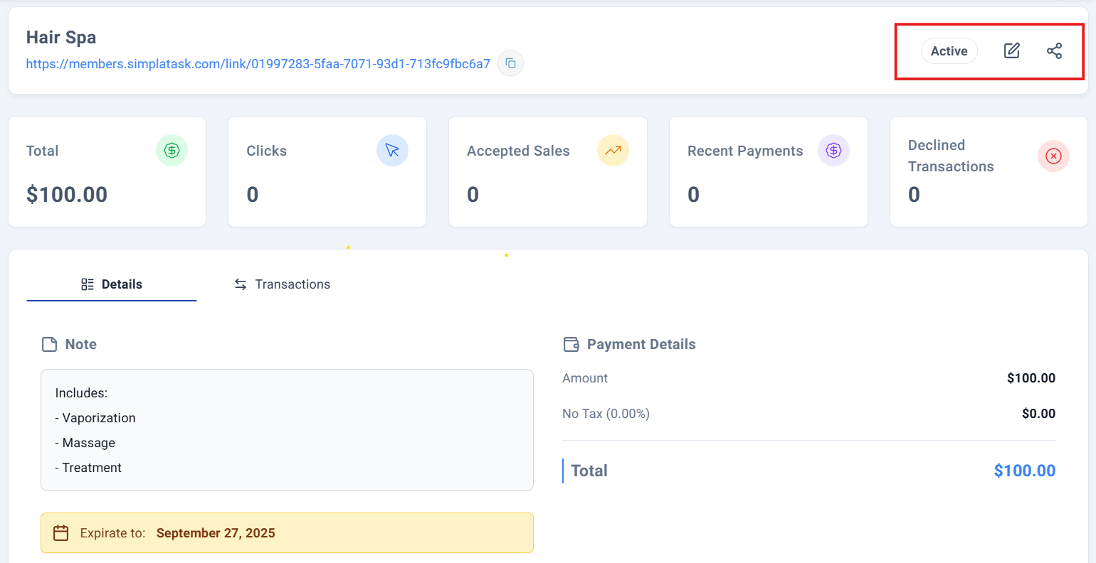 On the right side of this same section, you'll find essential controls: the payment link Status (Active or Inactive), followed by the Edit Icon and Sharing Options for multiple distribution channels.