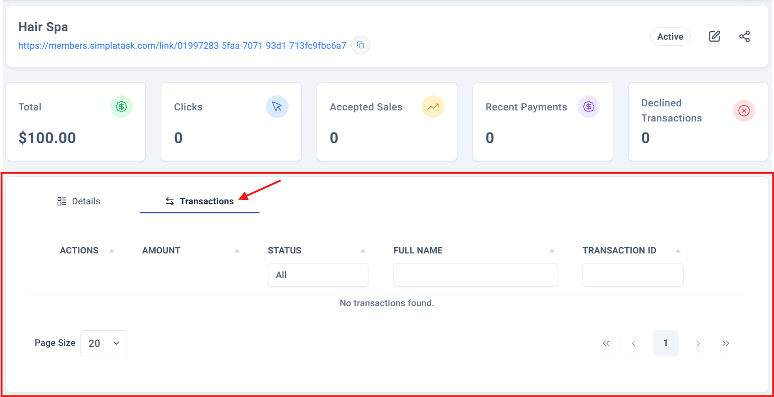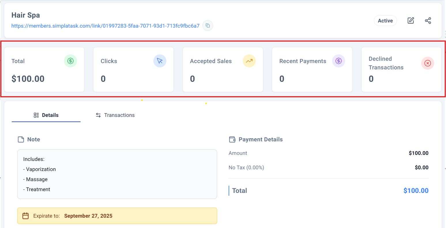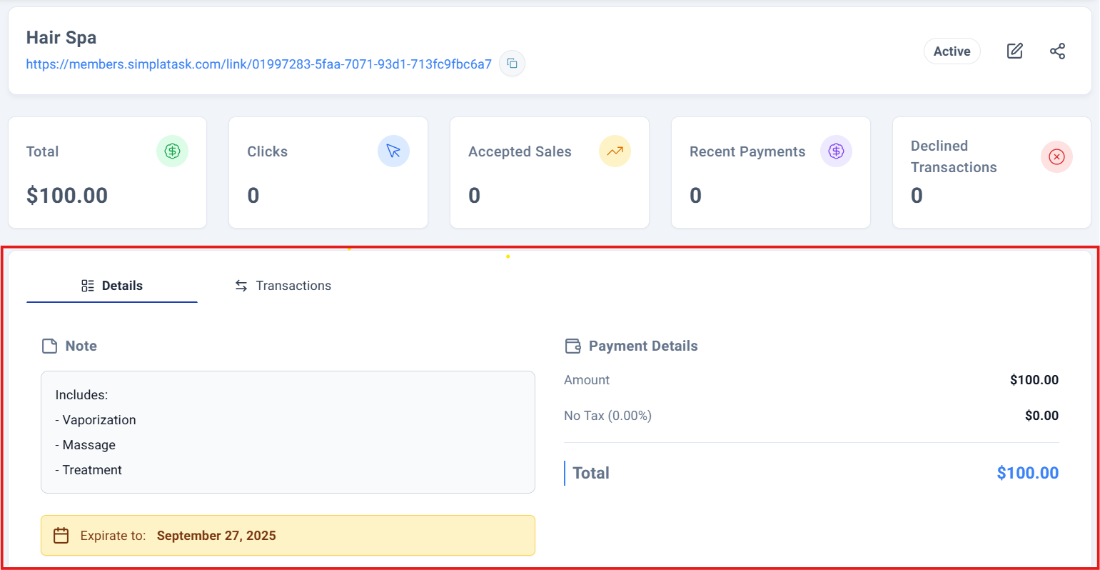 This will navigate you to a comprehensive detail panel where you can view all relevant information about that payment link.