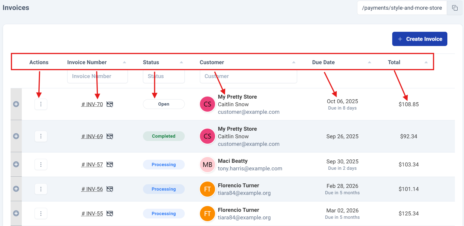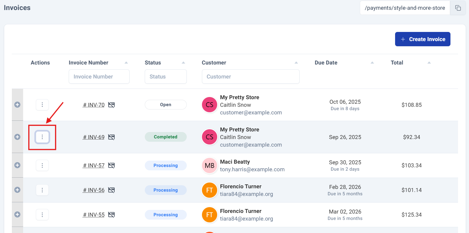 The first two columns provide quick-access options to perform various actions on your invoices.