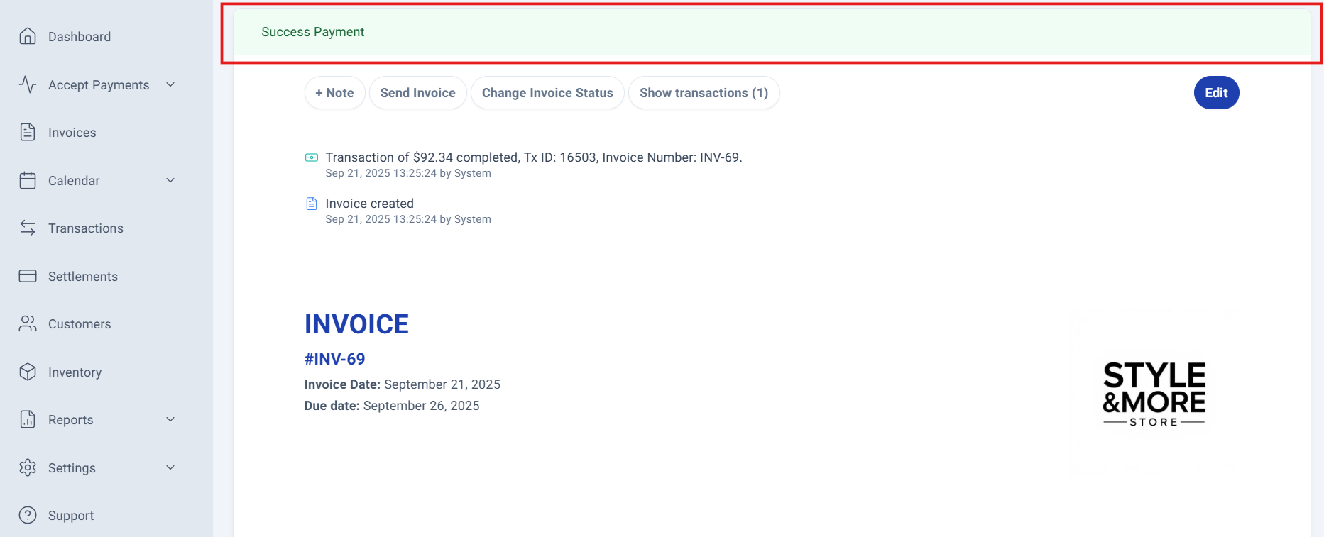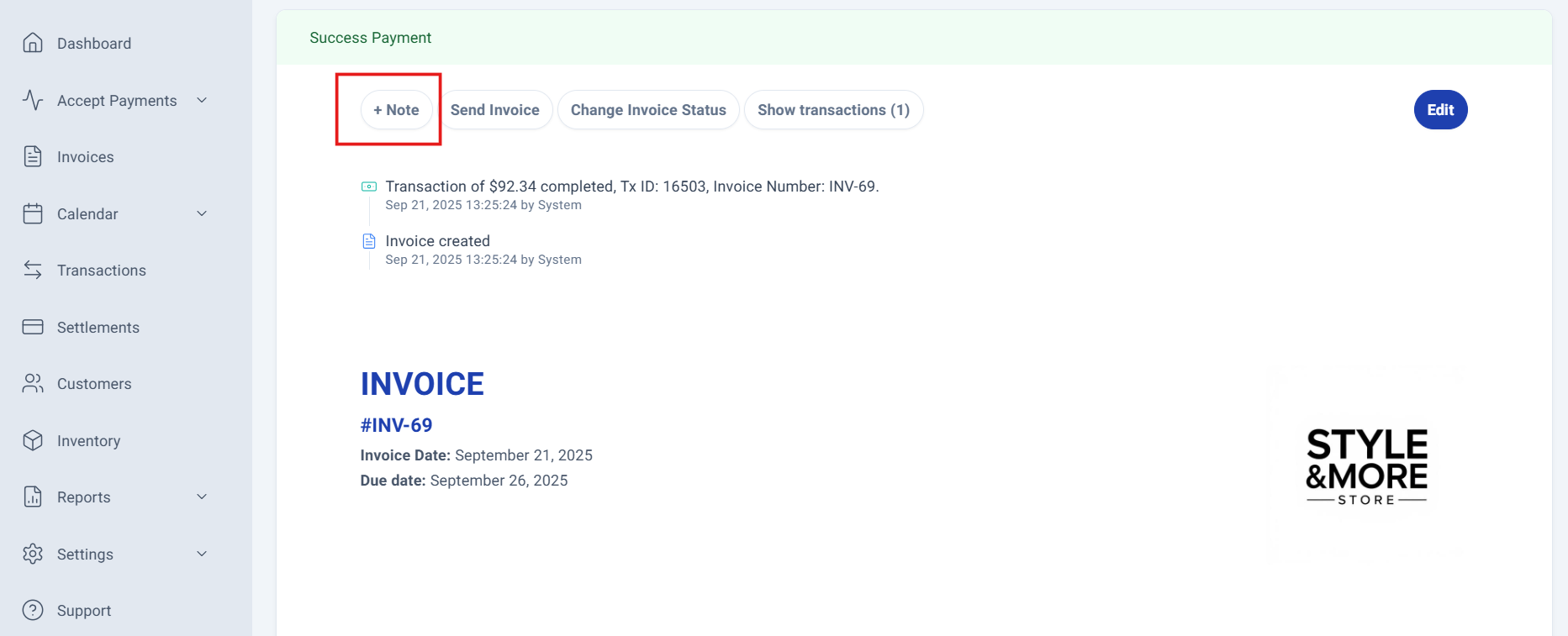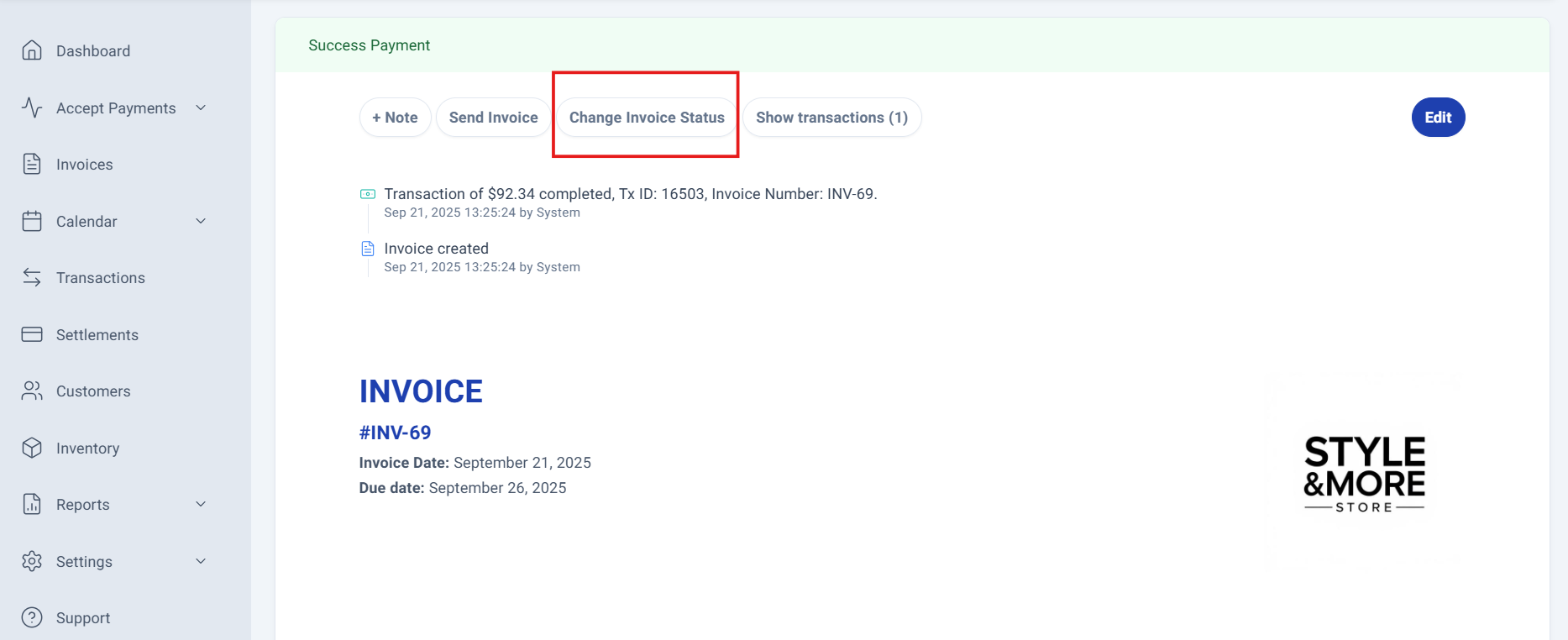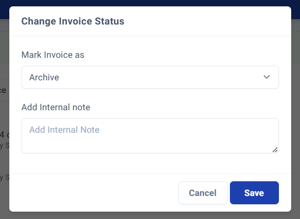 The Change Invoice Status button provides a dedicated window to update the invoice status and add internal notes for complete record-keeping.