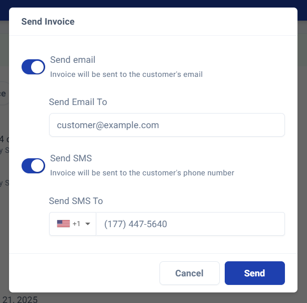 The Send Invoice button opens a comprehensive sharing interface, allowing you to distribute invoices through multiple channels: email and SMS.