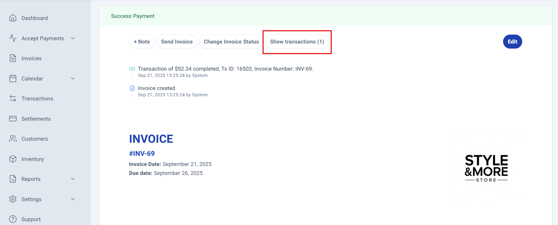 The Show Transactions option displays a detailed window with comprehensive information about all transactions associated with that invoice.