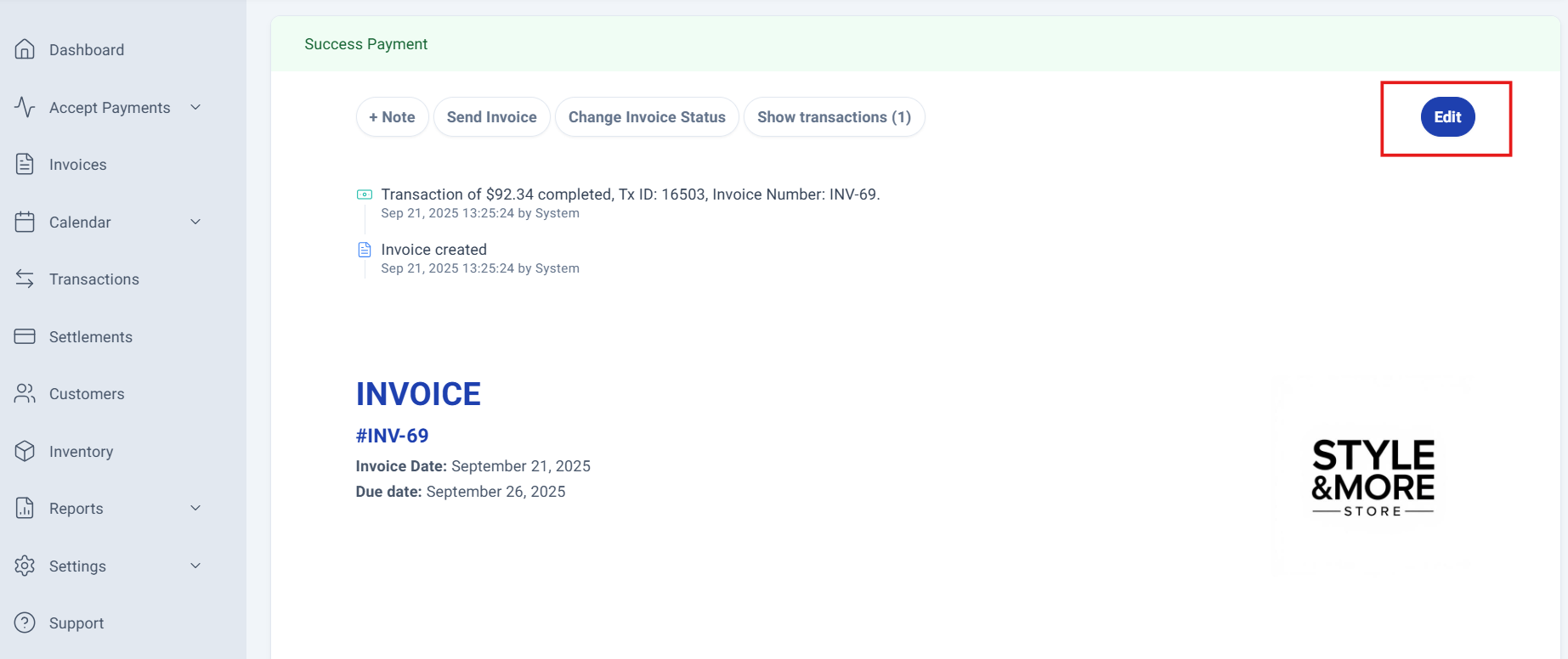 On the right side at the same level, you'll find the Edit button, which activates multiple editable fields for quick updates and corrections. If you need help updating an invoice, click here!