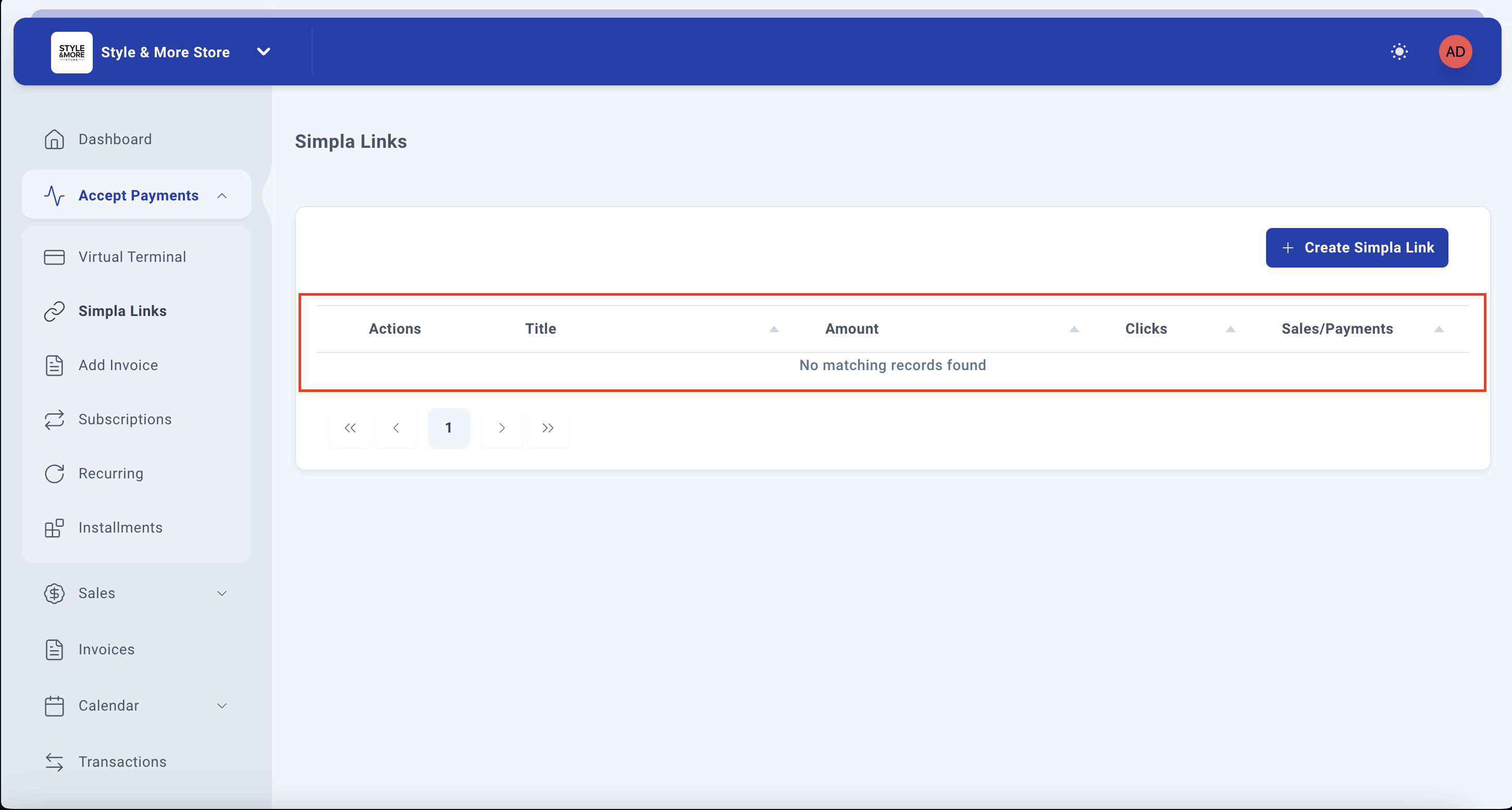 In the left sidebar menu, expand the "Accept Payments" section, then locate and click on the "SimplaLinks" option. This will take you to the Simpla Links management view.