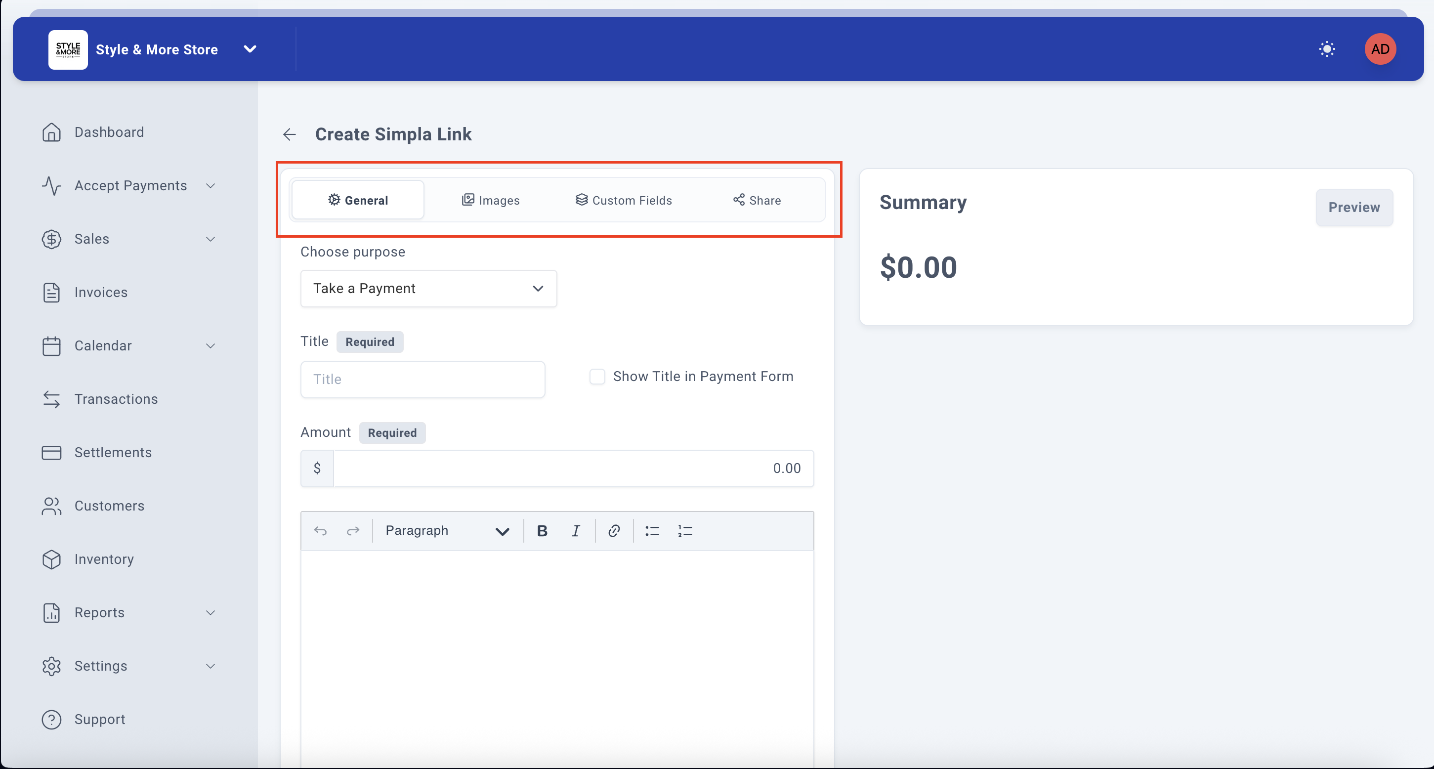After configuring your images, click back on the "General" tab to continue with the remaining settings for your payment link.