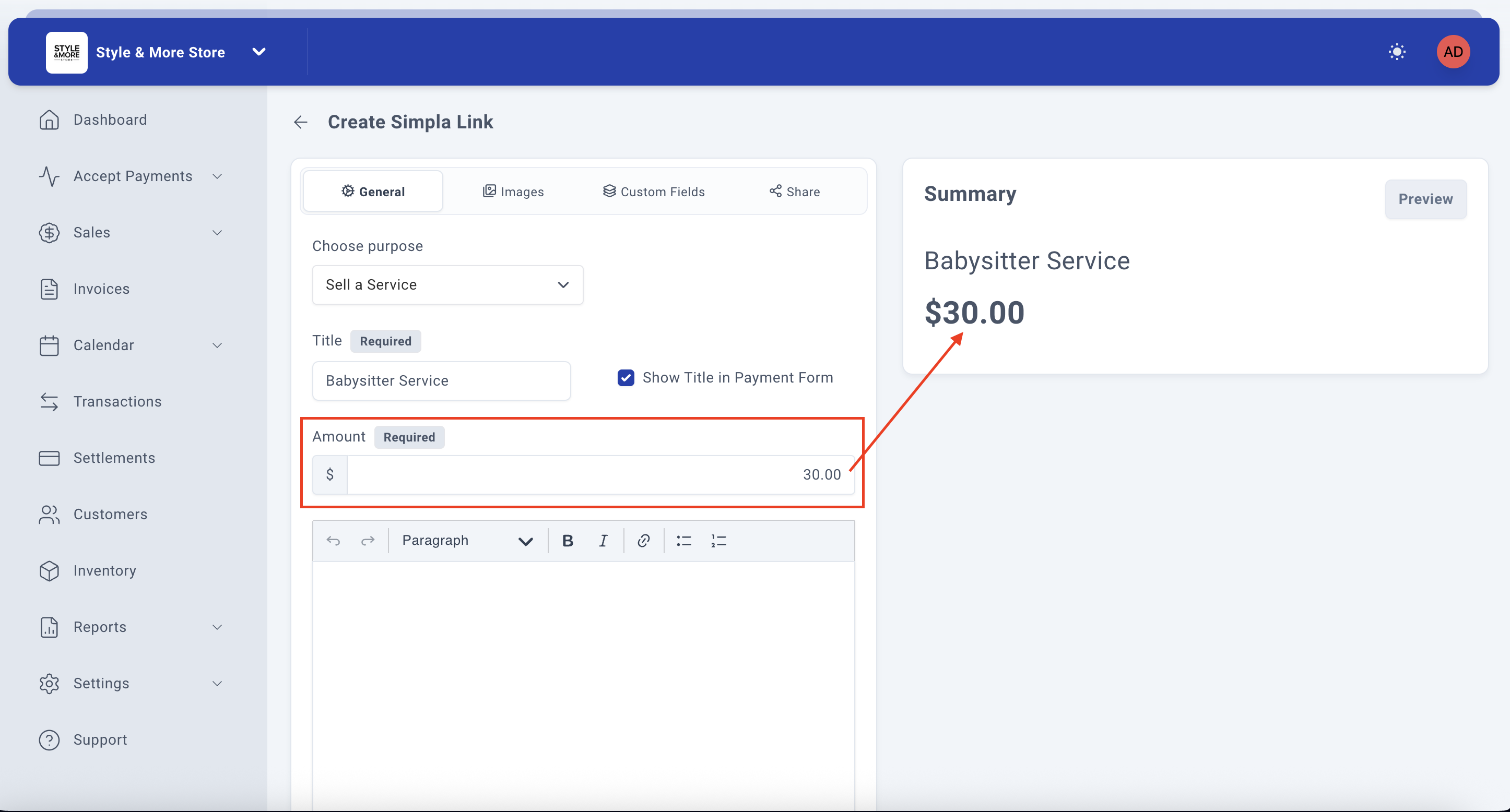 In the "Amount" field (marked as Required), enter the price for your service or product. The field accepts numerical values and automatically formats the currency.