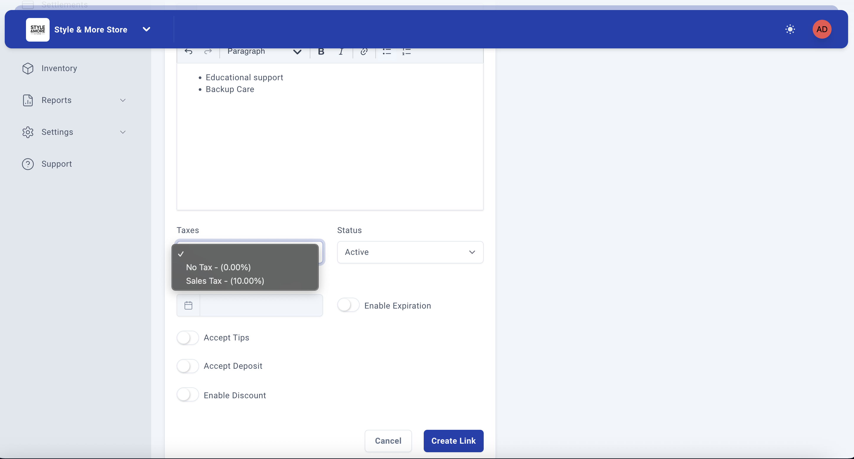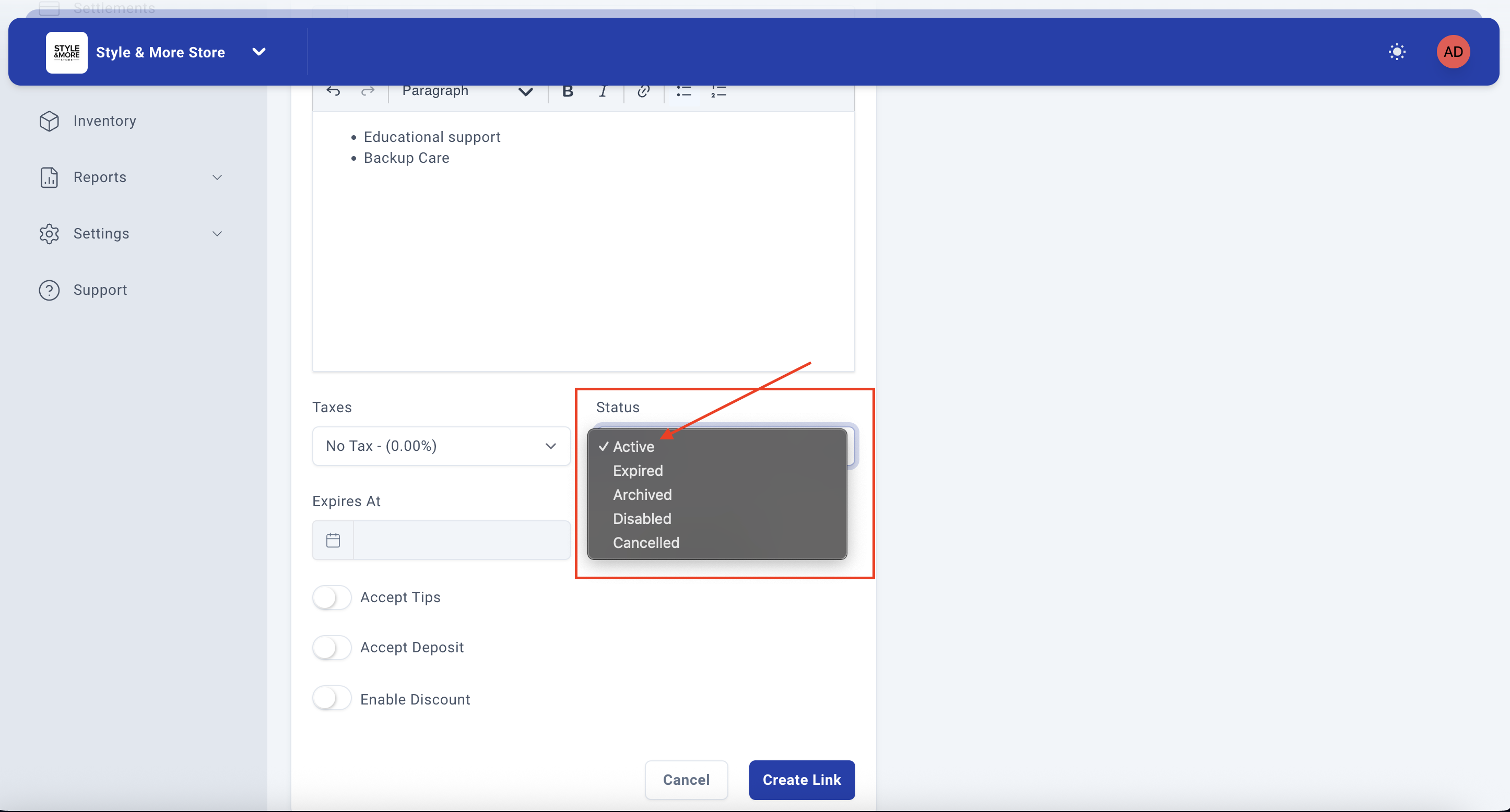 - Status - Set the payment link status (Active by default)