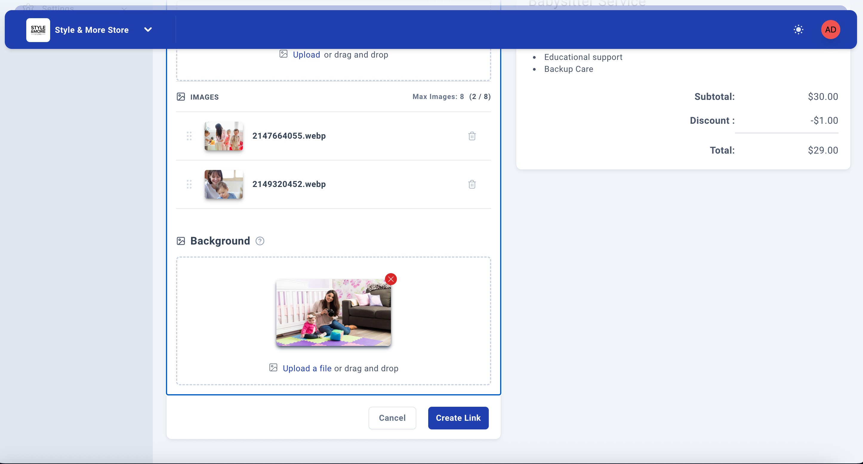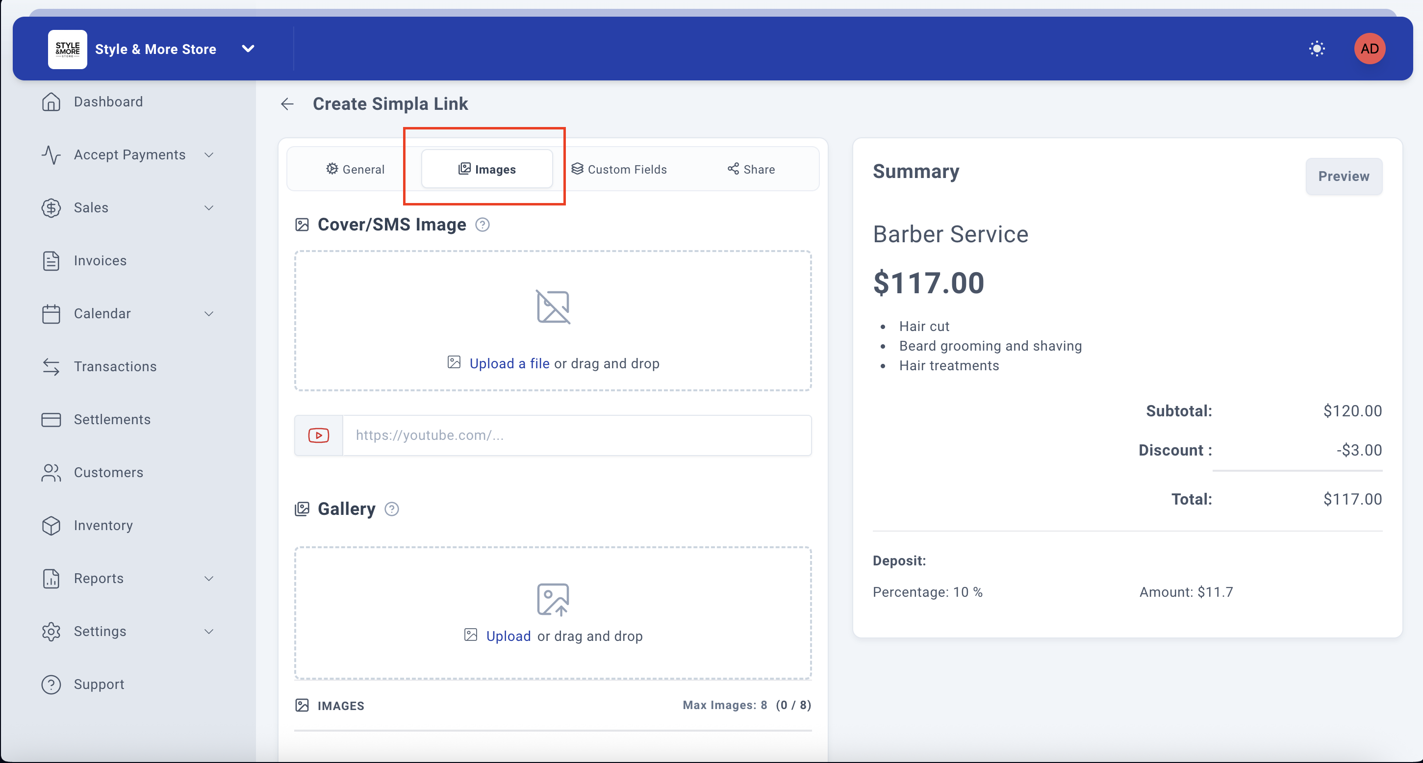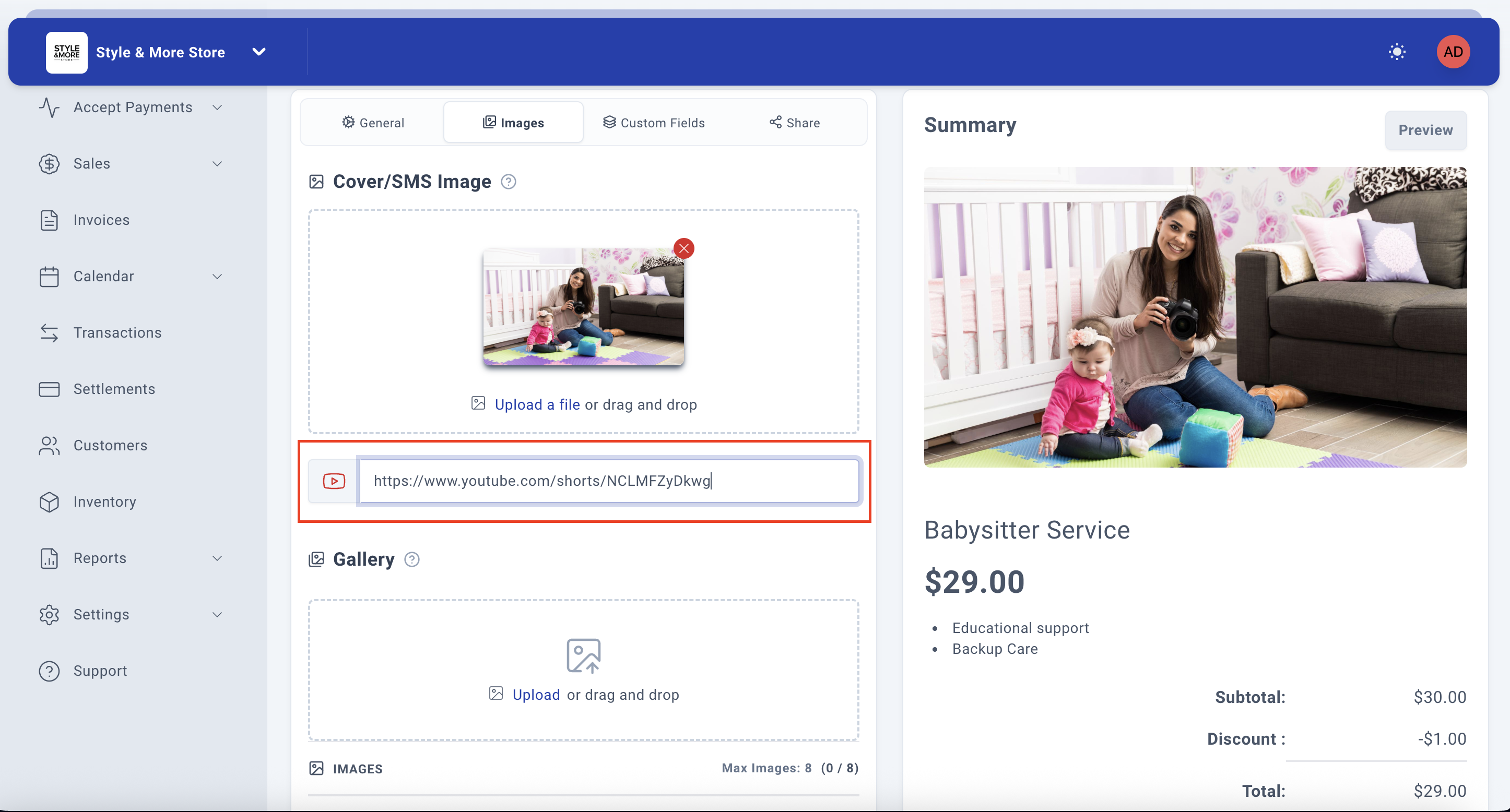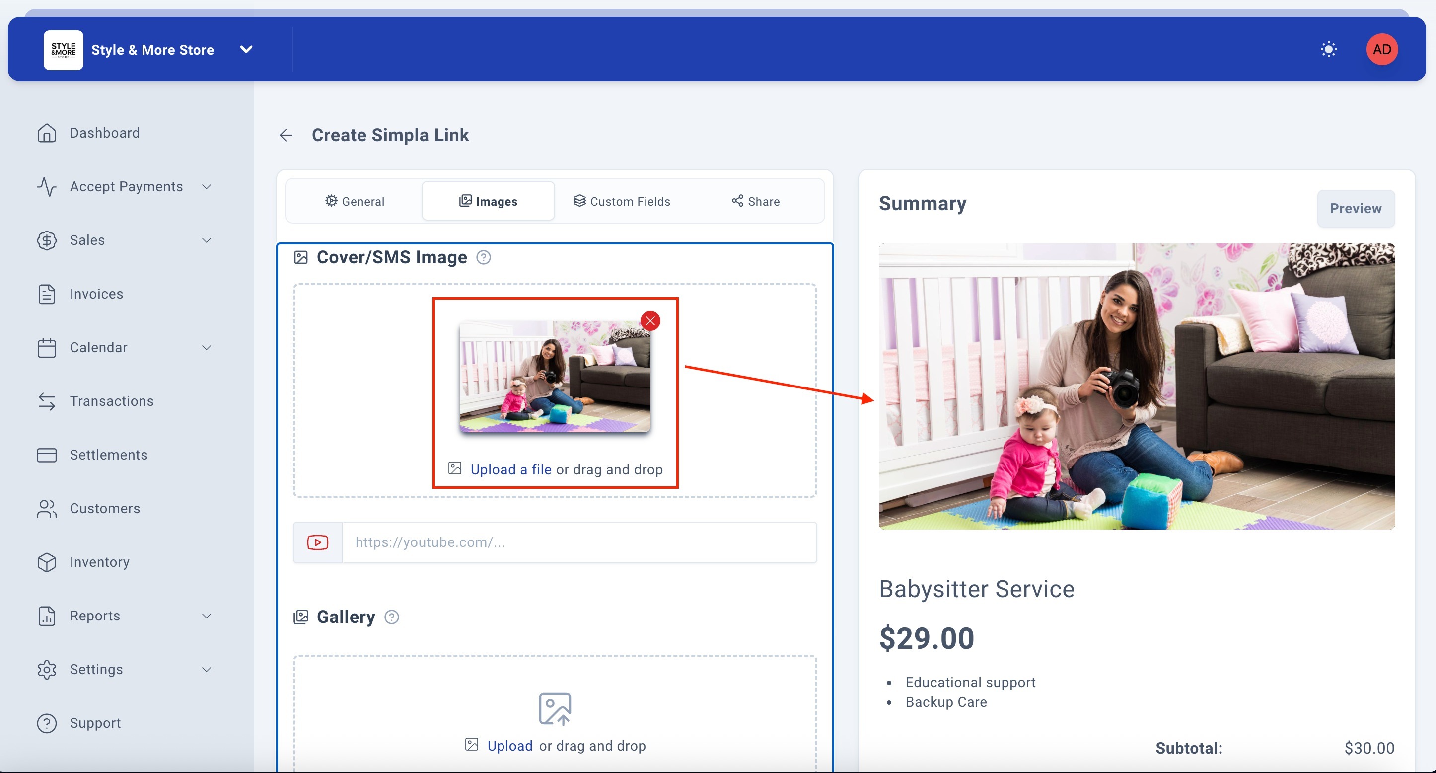 Note: Gallery images are displayed below the main cover image on your payment link, allowing customers to view multiple angles or examples of your service or product.
