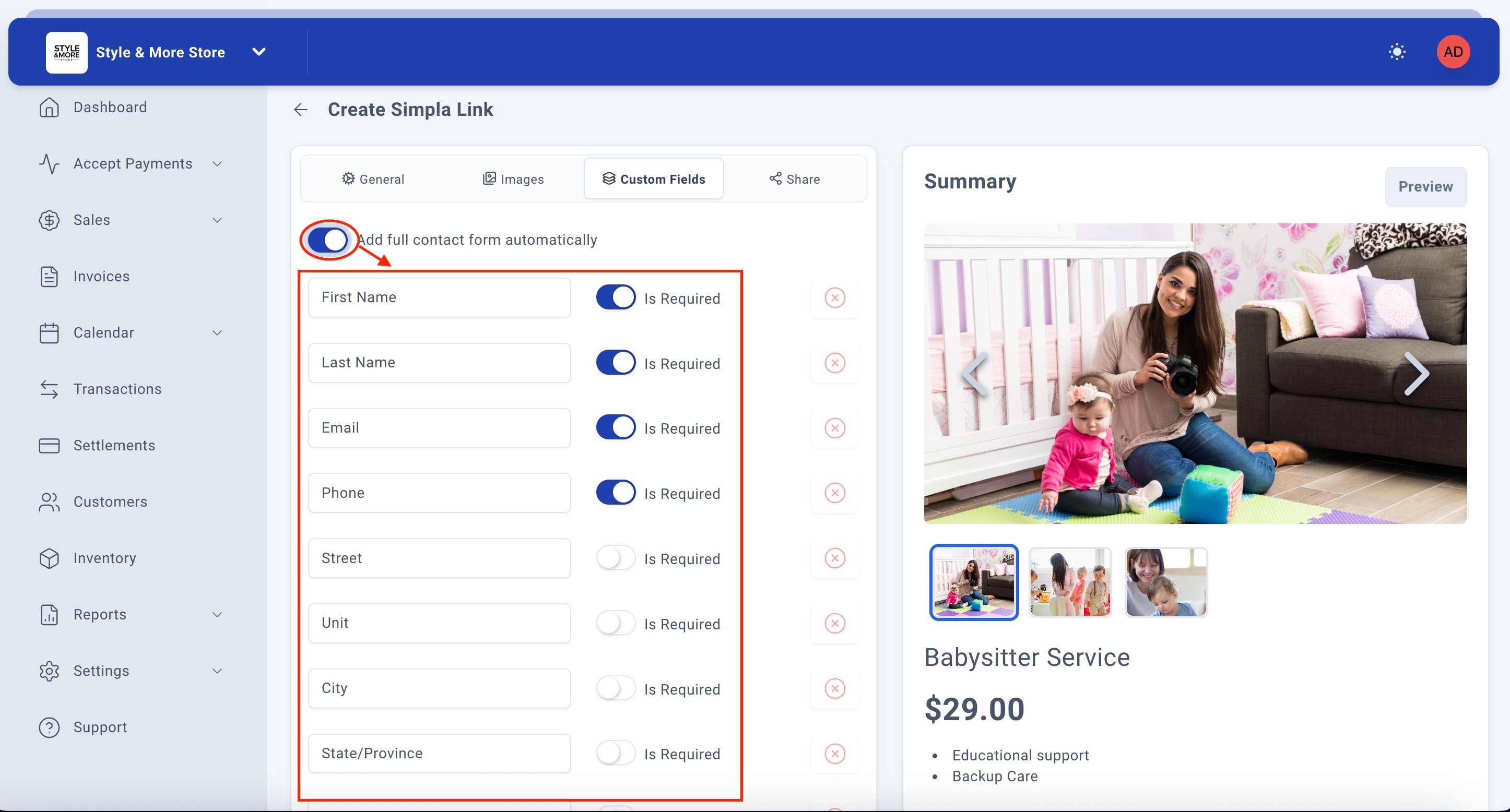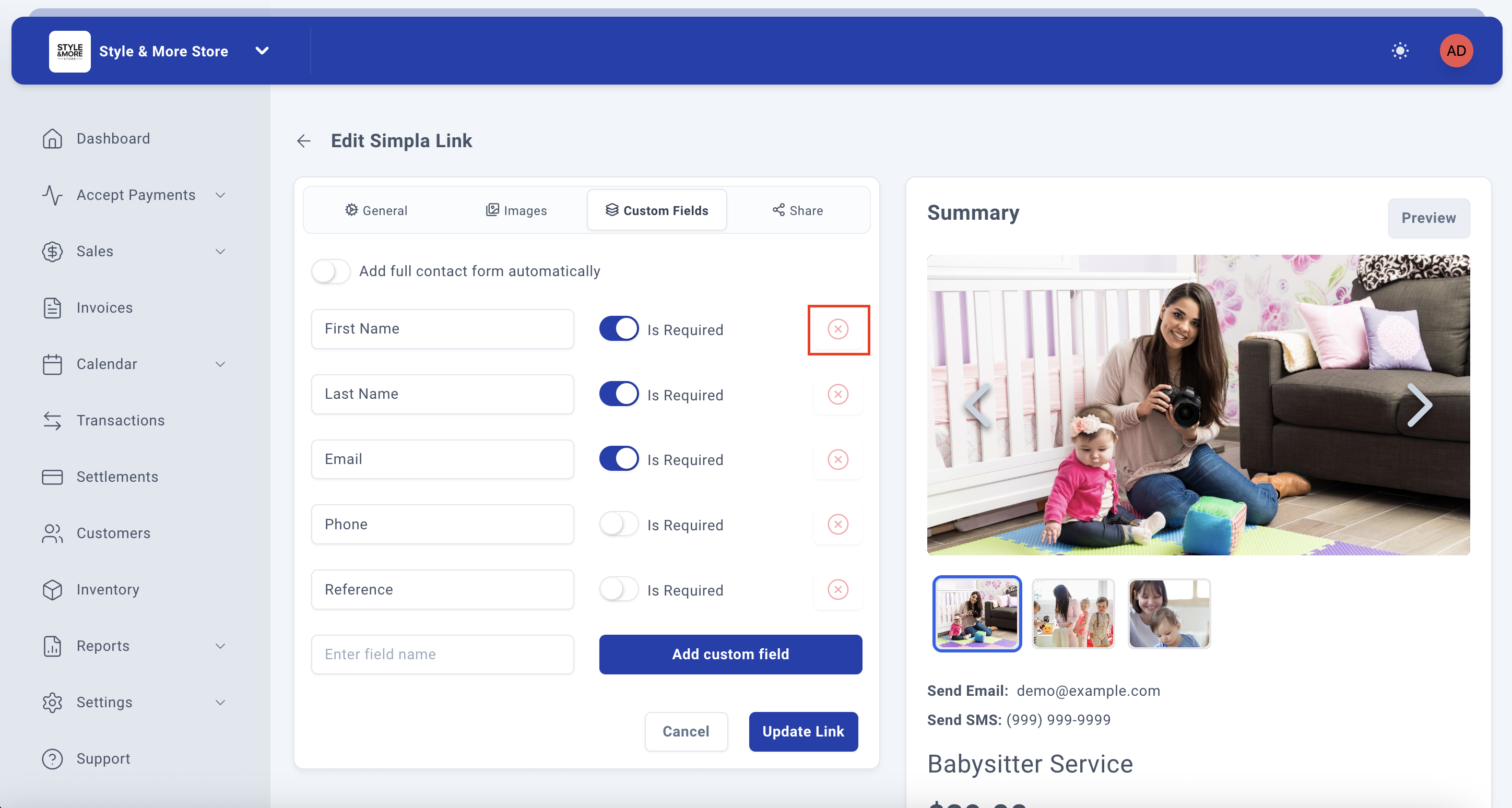 After completing the Images tab, click on the "Custom Fields" tab to add custom information fields that customers will need to complete when making a payment. This feature is useful for collecting specific information like reference numbers, special requests, or any other data relevant to your service.