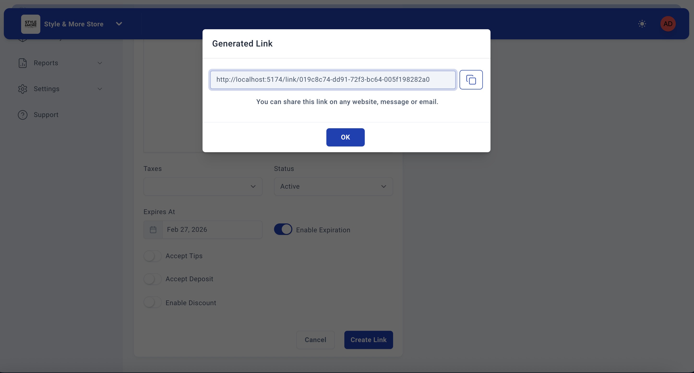- Enable Expiration - Toggle to set an expiration date for the payment link
