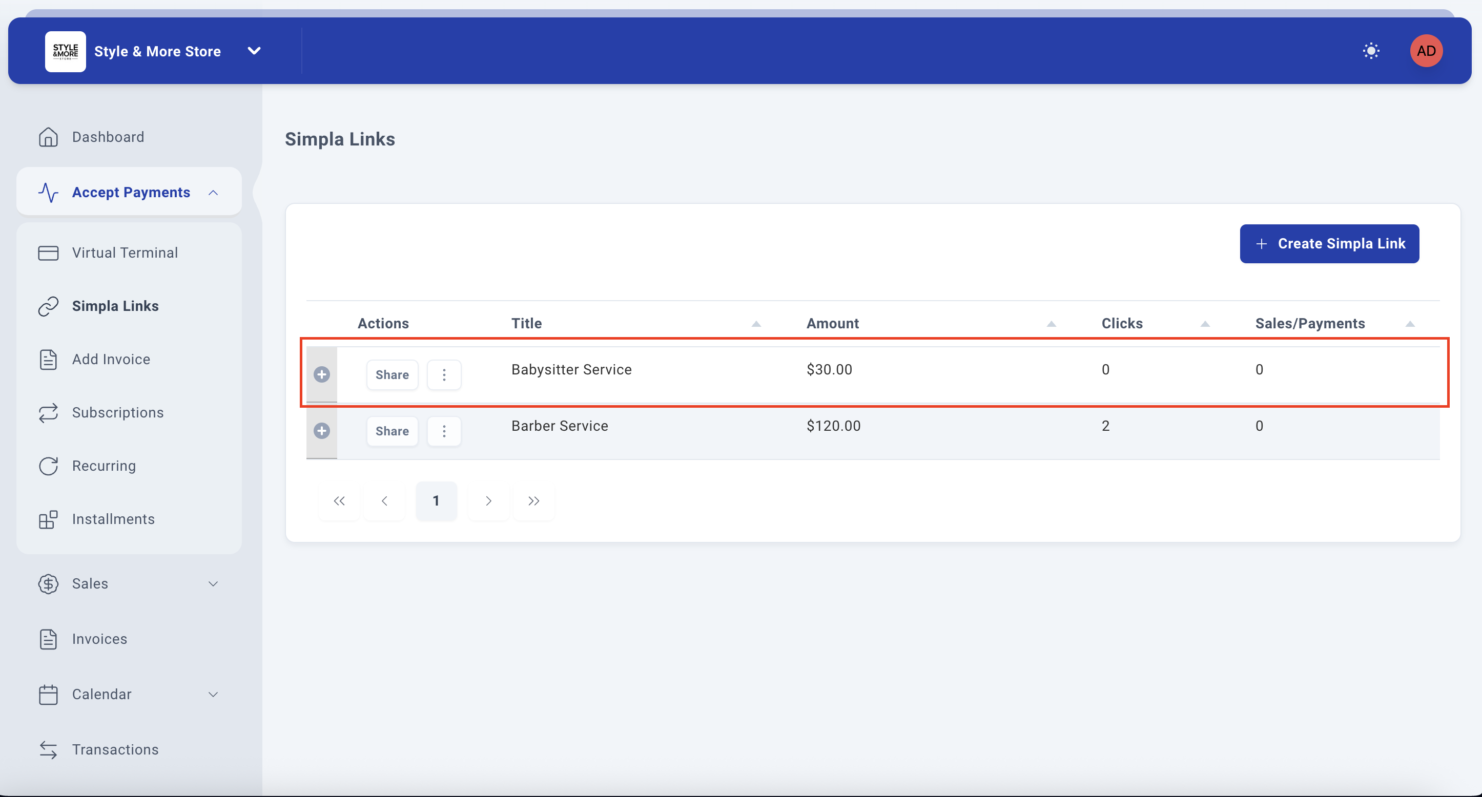 After clicking "Create Link", the system will generate your payment link and redirect you back to the Simpla Links management page where you'll see your newly created link listed in the table.